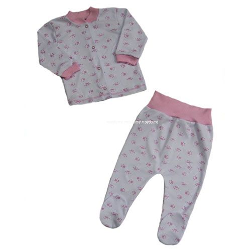 Комплект состоит из кофточки с воротничком, спереди на кнопочках и ползунков на еврорезинке.